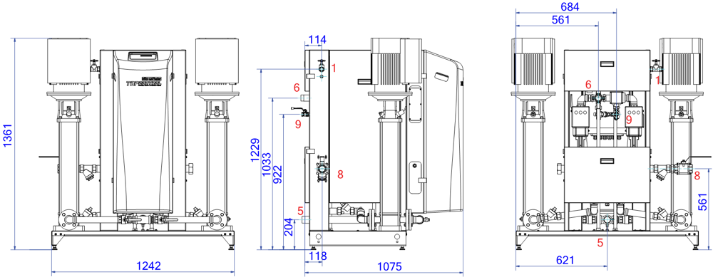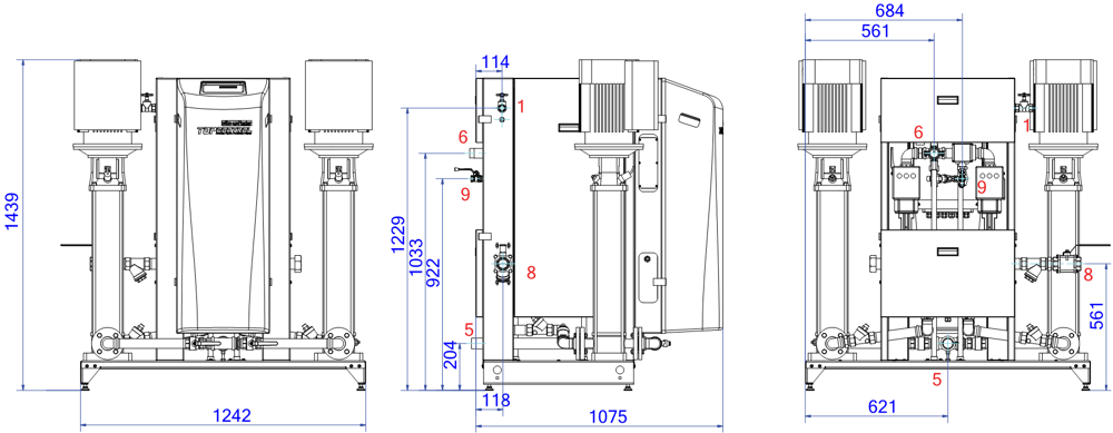 Groupe de maintien de pression automatique à pompes électroniques (VFD intégré) - 2 pompes (2X 100%) - 2 vannes de décharge motorisée réglable à distance. Modèle modulaire : un vase pilote est requis.